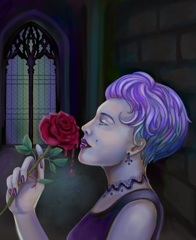 Une rose de sang est un mets rare et délicat. Aussi appelée ambroisie des poètes, elle s’obtient lors un processus complexe d’alchimie et de magie. Illustration numérique sur Krita.
